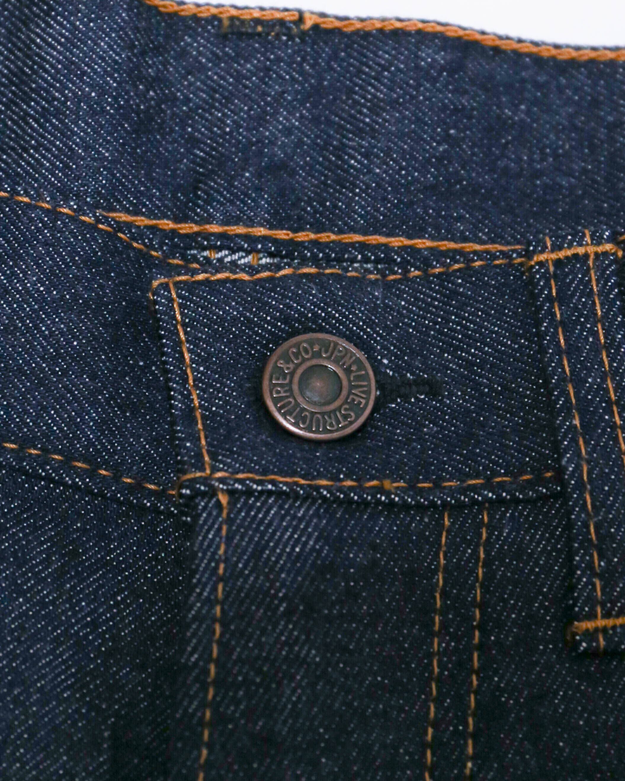 時代背景を踏まえ、オールオレンジステッチで縫製箇所により綿糸とコア糸を使い分け、シンガーやユニオンスペシャルといったヴィンテージミシンを使用し、熟練の縫製師により、縫い上げています。
